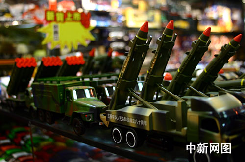 而在國際商貿(mào)城二期的旅游購物中心一家玩具商鋪,“移動(dòng)加榴炮發(fā)射車”、“洲際導(dǎo)彈發(fā)射車”、“后勤保障車”等曾在閱兵式上“亮相”的軍事武器玩具模型,一個(gè)方陣一個(gè)方陣地排列著,接受著市場的“大閱兵”。
