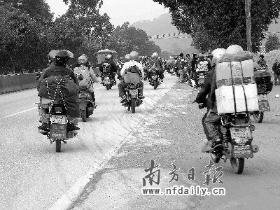 戴上頭盔、披上雨衣、載上家人,回家過年。春節(jié)臨近,由佛山、東莞、廣州等珠三角城市返鄉(xiāng)農(nóng)民工組成的10萬“摩托車返鄉(xiāng)大軍”,沿著321國道返回廣西、貴州、湖南和四川老家過年。他們穿著厚實的棉衣,結(jié)實的綁腿,棉質(zhì)護膝,防風(fēng)頭盔,皮手套,或成群結(jié)隊,或獨馬單騎,車上大多數(shù)是小兩口子,或者夾帶一個小孩,奔馳在國道上,成了春運交通線上一道道特殊的風(fēng)景。