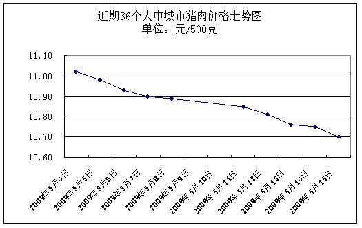 中新網(wǎng)5月18日電 據(jù)國家發(fā)展改革委價(jià)格監(jiān)測中心監(jiān)測,上周(2009.5.11-2009.5.15,下同)36個(gè)大中城市集市、超市豬肉(精瘦肉)平均零售價(jià)格每500克為10.77元,與前一周(2009.5.4-2009.5.8,下同)相比下降1.55%。