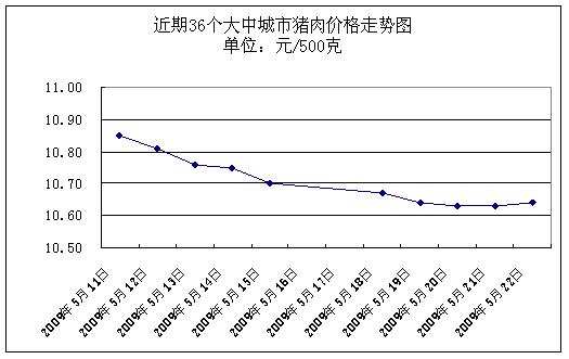 中新網(wǎng)5月25日電 據(jù)國家發(fā)改委網(wǎng)站消息,據(jù)國家發(fā)展改革委價(jià)格監(jiān)測中心監(jiān)測,上周(2009.5.18-2009.5.22,下同)36個(gè)大中城市集市、超市豬肉(精瘦肉)平均零售價(jià)格每500克為10.64元,與前一周(2009.5.11-2009.5.15,下同)相比下降1.21%。