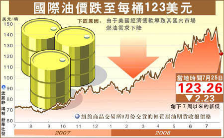 勇闖150美元/桶關(guān)口未果,國際原油價(jià)格連日來大幅下挫。上周最后一個(gè)交易日(7月25日),紐約商品交易所原油期貨價(jià)格跌至每桶123美元水平,創(chuàng)下7周以來新低。與本月11日創(chuàng)下的每桶147.27美元的盤中歷史最高紀(jì)錄相比,紐約商品交易所原油期貨價(jià)格在半個(gè)月內(nèi)已累計(jì)下跌超過24美元。
