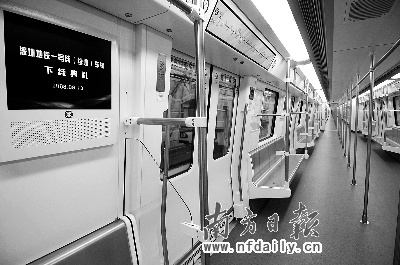 記者發(fā)現(xiàn),車廂比廣州3號線地鐵要寬敞。據(jù)介紹,廣州3號線地鐵車輛是B型車,寬度只有2.8米,又是直線型車體。相比之下,深圳地鐵一號線(續(xù)建)車輛車體寬達(dá)3.1米,且采用鼓形車體,視覺效果也要寬敞許多,據(jù)悉,最大載客量可達(dá)2502人。