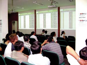 ORS證券公司位于胡志明市第一郡,與胡志明證券交易所一街之隔。隨著越南指數(shù)從2007年3月12日的歷史最高點(diǎn)1170點(diǎn)跌至今年6月的370點(diǎn)低位,幾月以來(lái),這里已經(jīng)成了大多數(shù)股民的“傷心地”。不過(guò),昨天上午9點(diǎn),想在這里找到一個(gè)位子已經(jīng)不太容易。而交易大廳偶爾響起的掌聲更將人們心頭的陰霾一掃而空,“漲了!睅讉(gè)股民對(duì)自己的收獲很滿(mǎn)意。