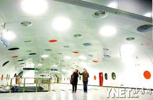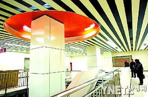 “太空艙”———這是記者對“金臺夕照”站廳裝修的直接印象。寬闊站廳內(nèi),兩側(cè)墻壁如括號般向內(nèi)彎曲形成類似機(jī)艙的形狀。除了地面之外,無論墻壁還是天花板,圓形白光燈池和橘紅色色塊如密集的氣泡一樣分布,大的直徑可達(dá)1米,小的直徑才20厘米左右。面對如此現(xiàn)代風(fēng)格的設(shè)計,“金臺夕照”仿佛被賦予了新的生命。