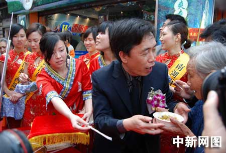 中新網(wǎng)廣州4月7日電 (記者 莫非 通訊員 林月明)大方漆器、布依地毯、蠟染、玉屏簫笛等讓人眼花繚亂,貴陽的氣息撲面而來。廣東首家“貴陽形象店”7日在南湖國旅·西部假期位于廣州上下九步行街的營業(yè)點(diǎn)落戶。在開業(yè)現(xiàn)場,貴陽旅游局副局長方隨洪更是走上街頭,請(qǐng)老廣品嘗正宗美味的酸湯魚,同時(shí)還將香囊等貴陽的小特產(chǎn)親手贈(zèng)送給市民,邀請(qǐng)老廣齊赴貴陽旅游。