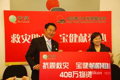 災難發(fā)生后,寶健是第一家積極響應中國青少年發(fā)展基金會號召進行抗震救災助學捐款的公司。截止目前,寶健公司通過與中國青基會共同設立的“寶健自主基金”,向災區(qū)累計捐贈的?睢⑽镔Y已超過800萬元人民幣,這些款項和物資將主要用于支持希望工程、支持學生救助和學校重建,并向災區(qū)同胞提供所需要的一些恢復體能、提高抵抗力的健康食品等賑災工作。