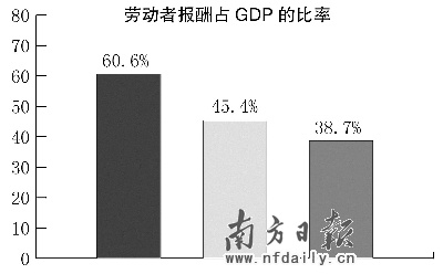 2000年—2006年間,勞動(dòng)者報(bào)酬占GDP的比率從45.4%降到38.7%,6年降低了6.7個(gè)百分點(diǎn)。如果與改革開放初1978年的60.6%相比,下降幅度則達(dá)21.9個(gè)百分點(diǎn)。而且,廣東居民收入增速慢于東部沿海5省份,也慢于泛珠九省。
