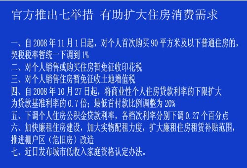 從2008年11月1日起,對個人首次購買90平方米及以下普通住房的,契稅稅率暫統(tǒng)一下調(diào)到1%;對個人銷售或購買住房暫免征收印花稅;對個人銷售住房暫免征收土地增值稅。地方政府可制定鼓勵住房消費(fèi)的收費(fèi)減免政策。[詳細(xì)內(nèi)容]