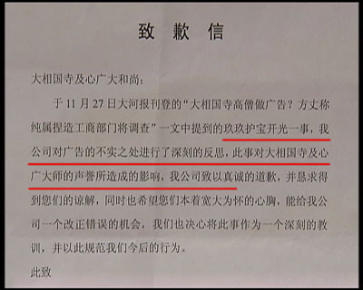 就在記者對玖玖理療褲的虛假廣告進行調(diào)查時,河南開封大相國寺向記者出具了一份玖玖理療褲河南開封經(jīng)銷商,寫給大相國寺的一封致歉信,承認(rèn)自己假冒僧人的錯誤行為,從此廣告中來自大相國寺的高僧空智,就如同人間蒸發(fā),再也沒有出現(xiàn)過,取而代之的是佛教禪宗第36代傳人,但卻有著相同的名字和面孔——空智。