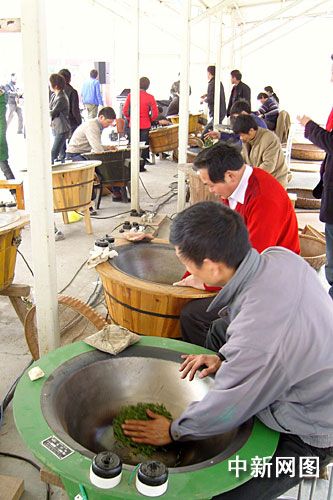 3月25日上午8時(shí),剛下過濛濛細(xì)雨的天空漸漸放晴,西湖區(qū)2009年西湖龍井“炒茶王”爭霸賽在龍塢茶葉交易中心順利舉行。說來也巧,在首輪抽簽環(huán)節(jié)中,兩位往年的“炒茶王”相繼抽到了1號(hào)和2號(hào),面對(duì)面地形成了“炒茶王”爭霸賽的第一個(gè)高潮——“雙王爭霸”的精彩場面。為公平比賽,此次所有參賽選手炒制的青葉原料都來自同一塊茶地。比賽中,每位選手都領(lǐng)到了2斤青葉,在經(jīng)過殺青、輝鍋、整理、二次輝鍋等工序后,以抽簽號(hào)裝袋后送由國家級(jí)一、二級(jí)評(píng)茶師和龍井茶葉產(chǎn)業(yè)協(xié)會(huì)秘書長等評(píng)茶高手組成的評(píng)審團(tuán)評(píng)審。評(píng)審團(tuán)則通過觀、聞、品等方法,對(duì)各位選手炒制的茶葉外形、香氣、滋味、湯色、葉底等進(jìn)行打分,最后以綜合得分的高低產(chǎn)生“炒茶王”。