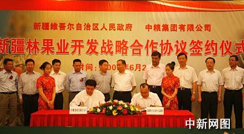 中新網(wǎng)烏魯木齊6月24日電 (記者 汪金生) 新疆維吾爾自治區(qū)政府24日與中糧集團簽署《新疆林果業(yè)開發(fā)戰(zhàn)略合作協(xié)議》,這次簽約是中糧集團與新疆在番茄、制糖、油脂、飲料等業(yè)務開展合作基礎上的又一項重要合作,拉開了中糧集團全面進軍新疆林果業(yè)開發(fā)的序幕,奠定了新疆林果業(yè)產(chǎn)業(yè)升級、做大做強的基礎。