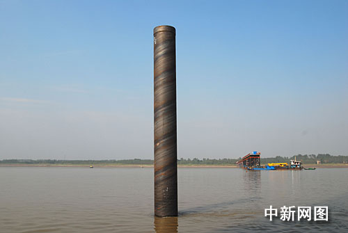 中新網(wǎng)九江10月15日電(胡國林)10月15日,施工人員在九江新長江大橋所在的江面上用打樁船打下第一根鋼管樁,九江新長江大橋第一根鋼管樁在江面成功豎立。