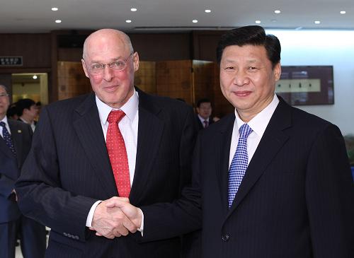 在會見保爾森時(shí),習(xí)近平說,中美都是世界上有重要影響的國家。在推動世界經(jīng)濟(jì)復(fù)蘇和可持續(xù)增長、處理國際和地區(qū)熱點(diǎn)問題以及維護(hù)世界和平與安全等方面,中美兩國擁有廣泛的共同利益,肩負(fù)著重要責(zé)任。中方一貫高度重視中美關(guān)系,愿與美方共同努力,尊重彼此核心利益和重大關(guān)切,妥善處理分歧和敏感問題,加強(qiáng)各領(lǐng)域?qū)υ、交流與合作,推動中美關(guān)系沿著積極合作全面的軌道向前發(fā)展。習(xí)近平深入闡述了中方在中美經(jīng)貿(mào)關(guān)系、人民幣匯率等問題上的原則立場,期待保爾森繼續(xù)發(fā)揮影響力,為促進(jìn)中美在經(jīng)濟(jì)金融領(lǐng)域的對話合作和后國際金融危機(jī)時(shí)期兩國經(jīng)濟(jì)關(guān)系健康穩(wěn)定發(fā)展發(fā)揮積極作用。