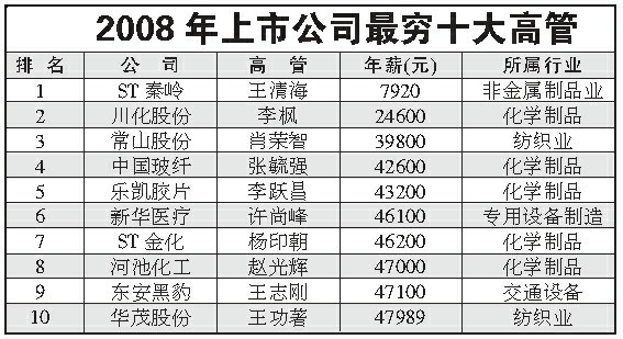 在最窮總經(jīng)理前十中,化學(xué)制品行業(yè)占據(jù)了5人,其他的行業(yè)則較為分散。另外,這十位總經(jīng)理所在的上市公司,有3家2008年凈利潤(rùn)虧損,有7家凈利潤(rùn)同比下降。