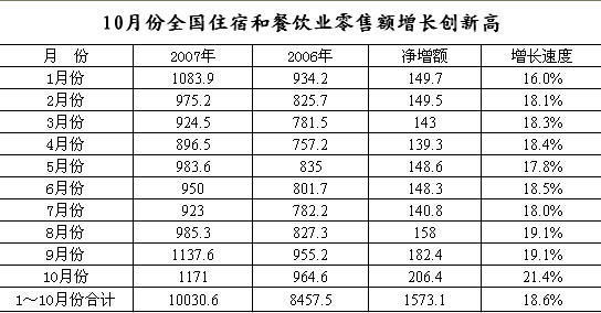 中新網(wǎng)11月20日電 據(jù)中國商務(wù)部網(wǎng)站消息,商務(wù)部商業(yè)改革司根據(jù)有關(guān)數(shù)據(jù)分析,今年10月份餐飲消費十分旺盛,餐飲市場再現(xiàn)婚慶喜宴多、家庭聚餐多的規(guī)律性突出特點,全國住宿與餐飲業(yè)零售額實現(xiàn)1171億元,比去年同期增長21.4%,增幅高出3.5個百分點,比上月增幅高出2.3個百分點,創(chuàng)月度新高。