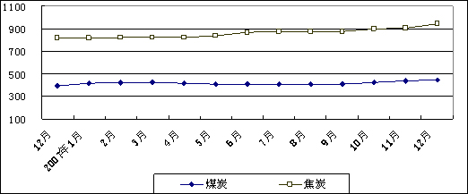 圖2-1:主產(chǎn)省煤炭和焦炭?jī)r(jià)格(單位:元/噸)