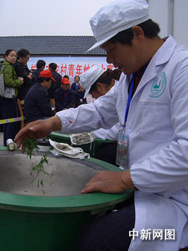 上午9點,杭州市農村青年炒茶大賽開始。30多口炒茶鍋分成兩列排開,選手們挽起袖子,在鍋底抹上一點茶樹油,抓上剛剛采摘的春茶青葉丟下鍋。不停地拋、捫,兩分鐘時間,一股清新的茶香彌漫開來。