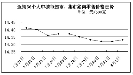 中新網(wǎng)8月4日電 國(guó)家發(fā)改委網(wǎng)站消息稱(chēng),據(jù)國(guó)家發(fā)展改革委價(jià)格監(jiān)測(cè)中心監(jiān)測(cè),上周(7月28日-8月1日)全國(guó)36個(gè)大中城市超市、集市豬肉(精瘦肉)平均零售價(jià)格每500克為14.33元,比前一周(7月21日-7月25日,下同)下降0.35%。