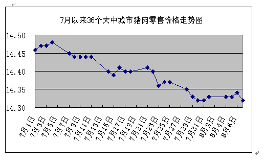 中新網(wǎng)8月11日電 據(jù)國家發(fā)改委網(wǎng)站消息,發(fā)改委價(jià)格監(jiān)測中心監(jiān)測顯示,上周(8月4日~8月7日)全國36個(gè)大中城市集市、超市豬肉(精瘦肉)平均零售價(jià)格每500克為14.33元,與前一周(7月28日~8月1日,下同)持平。