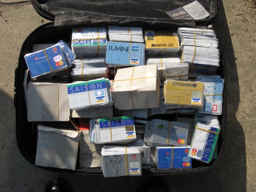此刻,年輕女子略微猶豫了一下。當(dāng)她抬頭看到民警威嚴(yán)的目光時(shí),只好停住腳步,蹲下身體將拉桿箱的拉鏈打開(kāi)。就在女青年打開(kāi)箱子的一瞬間,民警的懷疑更甚。原來(lái)里面全是信用卡,卡面上都是外文,而且來(lái)自不同的銀行。信用卡被整整齊齊地碼放在箱子中。