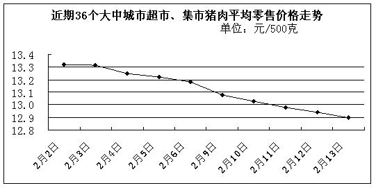 中新網(wǎng)2月16日電 據(jù)國(guó)家發(fā)展改革委價(jià)格監(jiān)測(cè)中心監(jiān)測(cè),上周(2月9日-2月13日)36個(gè)大中城市超市、集市豬肉(精瘦肉)平均零售價(jià)格每500克為12.99元,比前一周(2月2日-2月6日,下同)下降2.04%。