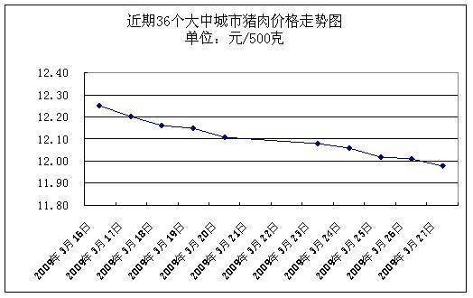 中新網(wǎng)3月30日電 據(jù)國家發(fā)展改革委價格監(jiān)測中心監(jiān)測,上周(2009.3.23-2009.3.27,下同)36個大中城市集市、超市豬肉(精瘦肉)平均零售價格每500克為12.03元,與前一周(2009.3.16-2009.3.20,下同)相比下降1.15%。