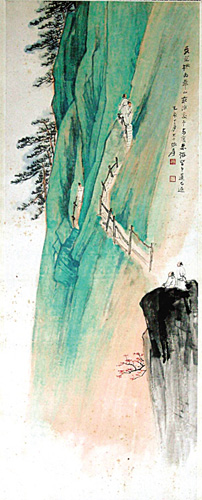 此外,張大千描繪華山長(zhǎng)空棧道險(xiǎn)峻奇崛的《華山行》,以145.6萬(wàn)元成交。張大千于1935年游浙江莫干山、洛陽(yáng)龍門及西安、華山,并為此舉辦了“關(guān)洛紀(jì)游畫展”,《華山行》即創(chuàng)作于此時(shí)。在似青綠山水卻又色不重的大片綠中,畫一長(zhǎng)空棧道,著以赭色,十分醒目。空棧上端點(diǎn)兩游者,相背、扶壁而立,一者小心看風(fēng)景,似不敢再往前;一者已有悔意,正想返身而下,這正應(yīng)和了畫面的款識(shí)“予每度來(lái)游,皆中道而返”,或許是大千自己的寫照吧。
