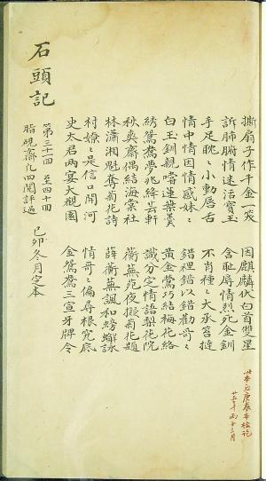 己卯本存四十一回又兩個(gè)半回,此本在31-40回的總目后寫有“脂硯齋凡四閱評(píng)過”、“己卯冬月定本”字樣,故稱。“己卯”為乾隆二十四年(1759),此紀(jì)年應(yīng)是此本底本的紀(jì)年,現(xiàn)存為過錄本。在這個(gè)過錄本上,有700余條雙行小字批語,另據(jù)此本上“祥”、“曉”字的避諱,研究者比對(duì)《怡府書目》,考定此本為怡親王允祥、弘曉府上的抄藏本,聯(lián)系到雍正二年御批中曾有“你(指曹頫,雪芹之父或叔父)是奉旨交與怡親王傳奏你的事的……”可知怡親王府與曹家的特殊關(guān)系,此本的底本或許就來自曹家,其價(jià)值可想而知。己卯本第1-20回、31-40回、61-70回(內(nèi)64、67兩回由后人補(bǔ)抄)原由董康、陶洙所藏,現(xiàn)藏國家圖書館;第55回下半至第59回上半現(xiàn)藏國家博物館。