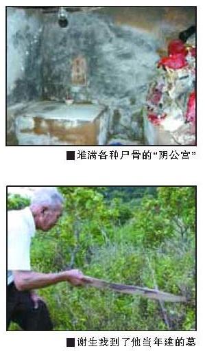 終于等來了曾做過“土公”的謝生。謝生今年76歲了,稍稍有些駝背,走路有些緩慢,但老人的頭腦非常清楚,眼中閃爍著令人敬畏的智慧的光芒。對記者提出的問題,老人回答得非常準(zhǔn)確,不夸大事實(shí),如果不知道也不妄加猜測!拔抑话徇^不到10個‘黃金甕’,都搬到鷓鴣山了。另一位‘土公’謝興搬得多,得有100多個,可惜他已經(jīng)去世了?吹降摹S金’很多都爛掉了,大部分只剩下了腿骨和手臂,少部分還存有一點(diǎn)點(diǎn)頭皮骨——腿骨和天靈蓋鈣質(zhì)比較多,所以一般保存得長久一些。腿骨很短,也就一個半拳頭長”,老人邊說邊用兩個拳頭在自己的小腿前比畫著。
