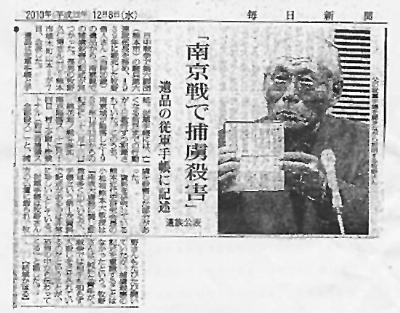 12月8日出版的日本《每日新聞》,以《“攻打南京的時候曾經(jīng)殺害過俘虜”——一名日軍士兵從軍日記中的記述》為題,刊登了記者結(jié)城薫的一篇消息,并附上了說明為“牧野久仁博正在介紹父親的從軍手記”的照片。