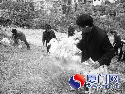 農(nóng)歷三月初三那天,他們掃墓的方式和清明掃墓是一樣的:先是由后人“掛紙”(在墳?zāi)股蠏旒埐蟾臑閴杭埐?作為上墳的標(biāo)志。掛紙之前,先鏟除墓上叢生的雜草,再將紙帛兩三張一疊折成波紋狀,再用小石塊壓在墳上。如果說墳?zāi)故亲嫦人篮缶幼〉膱鏊,那么壓紙就象征著子孫們一年一度為祖先的居所增添新瓦。掛完紙,再準(zhǔn)備簡單的供品祭墓,然后燒紙錢,兒孫們在祖先墓前跪拜行禮,這樣既盡了子孫孝道,也祈求祖先護(hù)佑子孫平安如意。