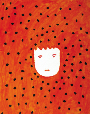 郭海平問記者:“如果是你,會如何表達(dá)‘掙扎’的抽象精神?”隨即他讓記者看了張玉寶的作品:沖擊力極強的橘紅色背景上,被扎上了無數(shù)個錯亂且刺眼的黑點,它們環(huán)繞在一個人頭四周,人臉表情有些呆滯。色彩強烈的反差,讓人感覺周圍恐怖的背景,隨時可能將人頭吞噬,人頭似在苦苦掙扎。整個畫面是那么干凈,但內(nèi)涵卻非常豐富。無論如何,你都不能猜到這是一個未經(jīng)任何繪畫訓(xùn)練的人畫出來的東西。