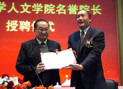 筆挺的黑西裝,黑亮的頭發(fā)整齊地后梳,昨日,83歲的金庸,氣定神閑地出現(xiàn)在浙江大學(xué)紫金港校區(qū)。雖然金庸口齒有些不清,走路也需要人攙扶,但絲毫不影響散發(fā)的英氣。他接過(guò)浙江大學(xué)校長(zhǎng)楊衛(wèi)遞過(guò)的“名譽(yù)院長(zhǎng)”聘書那一瞬間,意味著他正式卸任了浙大人文學(xué)院院長(zhǎng),可以靜心在英國(guó)讀書,并有望在未來(lái)的兩年內(nèi)拿到“貨真價(jià)實(shí)”的英國(guó)劍橋大學(xué)歷史學(xué)博士學(xué)位。