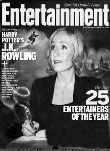 《娛樂(lè)周刊》按照一個(gè)班級(jí)里可能會(huì)出現(xiàn)的5種人來(lái)為娛樂(lè)界的名人定位,他們分別是天賦異稟、班中小丑、風(fēng)云達(dá)人、八卦之星和致詞代表。今年推出《哈利.波特》完結(jié)篇的羅琳沒(méi)被歸于其中任何一類(lèi),被選為“年度娛樂(lè)人物”。雜志認(rèn)為,羅琳完成了不可能完成的任務(wù),在電玩和在線游戲充斥、一切講究短小輕薄的年代,她施展魔法,讓數(shù)億大小孩抱著厚厚的印刷書(shū)籍愛(ài)不釋手,雜志如此評(píng)價(jià)說(shuō):“《哈利.波特》已賣(mài)出了4億冊(cè),并且拍成了有史以來(lái)最賺錢(qián)的電影系列片,羅琳讓人們圍著她老式的印刷大書(shū)團(tuán)團(tuán)轉(zhuǎn),好像這就是地球上最火熱的新娛樂(lè)手段似的!