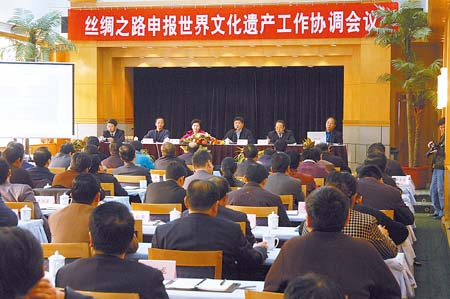 12月28日上午9時(shí),絲綢之路申報(bào)世界文化遺產(chǎn)工作協(xié)調(diào)會(huì)議在蘭州飯店8樓會(huì)議室召開,國(guó)家文物局局長(zhǎng)單霽翔、甘肅省副省長(zhǎng)咸輝、國(guó)家文物局文物保護(hù)司司長(zhǎng)顧玉才及79名相關(guān)省區(qū)代表參加了當(dāng)天的會(huì)議。會(huì)上,單霽翔向與會(huì)代表強(qiáng)調(diào)了絲路申遺的重大意義,并指出了全國(guó)48個(gè)申遺點(diǎn)存在的問(wèn)題和不足。