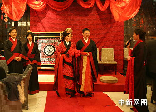 據(jù)新人說(shuō),穿上自己民族的禮服——漢服,為自己舉辦一場(chǎng)漢民族傳統(tǒng)婚禮,在越來(lái)越多代表民族傳統(tǒng)的東西被重新表達(dá)的今天,是件十分有意義的事。莊重、質(zhì)樸的周制婚禮儀式上的神圣,對(duì)“孝敬父母”、“夫婦之義”、“人倫之本”等民族精神內(nèi)涵的深刻闡述,都是時(shí)下泛濫的西式婚禮所遠(yuǎn)遠(yuǎn)不能與之相比的。
