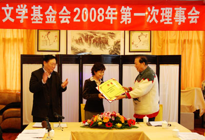 1月22日,在中華文學基金會2008年度第一次理事會上,中國作家協會主席鐵凝經全體理事推舉,受聘擔任中華文學基金會會長。中華文學基金會的老領導、中國作家協會名譽副主席張鍥向鐵凝頒發(fā)了會長聘書。鐵凝表示,感謝基金會理事們的信任,作為一名作家,不僅在1993年榮獲莊重文文學獎,更親眼目睹了中華文學基金會二十多年來服務作家、為繁榮我國文學事業(yè)所做出的貢獻。今后,愿與基金會全體同志一起努力,盡自己所能,為實現繁榮文學創(chuàng)作,培養(yǎng)文學人才,增進國內外學術交流,促進祖國文學事業(yè)的發(fā)展奉獻力量。理事會由中國作家協會黨組成員、副主席、書記處書記,中華文學基金會理事長高洪波主持,會上,理事們審議通過了基金會2007年工作總結和2008年工作計劃等九項議程。根據《基金會管理條例》和《中華文學基金會章程》,李小慧被推舉為中華文學基金會秘書長(專職)。中國作家協會名譽副主席鄧友梅等理事出席了理事會。