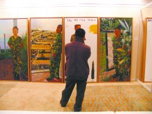 昨天在北京開始的為期兩天的預(yù)展是香港蘇富比春季拍賣巡展的第一站,展出上百件藝術(shù)品和瓷器工藝品,而會(huì)場(chǎng)正中的就是由18張海峽兩岸軍人肖像組成的《戰(zhàn)地寫生:新十八羅漢像》。這是“新寫實(shí)主義”代表藝術(shù)家劉小東2004年參加“金門碉堡藝術(shù)館──十八個(gè)個(gè)展”時(shí)創(chuàng)作的作品,他花了三個(gè)星期在中國(guó)大陸和臺(tái)灣的軍營(yíng)內(nèi),找來(lái)九位軍人作為肖像的主角,并在畫中記下他們的名字和籍貫,象征性地彰顯畫家對(duì)兩岸和諧合作的期盼。次年,這組作品在北京舉行的國(guó)際畫廊博覽會(huì)上以50萬(wàn)美元被來(lái)自西安的商人淡勃買下,轟動(dòng)一時(shí)。今年北京嘉德的春拍也將出現(xiàn)劉小東的油畫《溫床》,根據(jù)之前媒體的報(bào)道,這件作品的創(chuàng)作計(jì)劃也和淡勃的投資有關(guān)。除了劉小東,岳敏君、劉野等藝術(shù)家的作品也將出現(xiàn)在這次拍賣中。