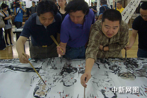 來自浙江畫院的池沙鴻等畫家共同完成向?yàn)?zāi)區(qū)遇難同胞表達(dá)哀思的作品。