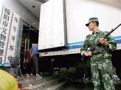 昨天,在荷槍實彈的武警押運下,包括漢代說唱俑、搖錢樹等國寶在內(nèi)的6091件文物從綿陽博物館緊急轉(zhuǎn)移到廣漢三星堆遺址博物館庫房存放。因擔心唐家山堰塞湖可能潰壩導致洪水毀壞文物,綿陽博物館決定緊急轉(zhuǎn)移2.5萬件文物,當天轉(zhuǎn)移了第一批。