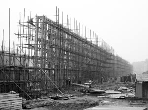 6月30日,記者在“唐山地震遺址紀(jì)念公園”的工程現(xiàn)場看到,盡管剛下過大雨,地上一片泥濘,但滿載沙石、物料的大貨車照舊進(jìn)進(jìn)出出,壓路機(jī)、大鏟車、小叉車也是隆隆作響。一排新建的鋼筋混凝土骨架像一道巨大的屏障,將整個工地截成南北兩塊。在它的西側(cè),已經(jīng)保存了32年的原唐山機(jī)車車輛廠鑄鋼車間地震遺址,在一層霧氣的籠罩中依舊桀驁地挺立在那里。