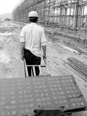 一位工人正把刻好地震罹難者名字的大理石塊運(yùn)到工地。