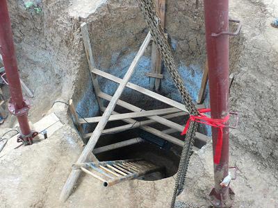 昨天下午,早報記者來到考古現(xiàn)場,看到一個小型起吊機已深入“井內(nèi)”。據(jù)介紹,圓形的地宮如同一口深井,直徑2.2米,在圓井的正中間,還發(fā)現(xiàn)四塊石板拼起的方框,未見滲水,放有一層銅錢。華國榮表示,結(jié)構(gòu)和內(nèi)容正在逐步認識過程中。