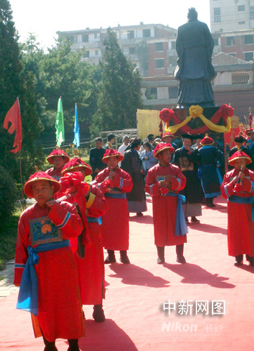 中新網(wǎng)吉林9月28日電(蒼雁) 9月28日上午9時,吉林市與美國洛杉磯孔子研究會舉在吉林文廟舉行祭孔大典。在祭孔大典中,著清代服飾的八佾舞表演,集樂、歌、舞、禮于一體,再現(xiàn)乾隆年間國學(xué)祭孔的盛況。