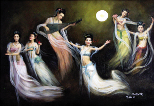 朱澤斌還講述了靈感的來(lái)源:“一輪月光照著寒冷朦朧的天空,6個(gè)仙女在廣寒宮周?chē)w翔著、舞蹈著。她們身穿著宮衣、游泳衣和運(yùn)動(dòng)衣組合的服飾,飛到一起來(lái)了,飛向了廣州。去年中秋節(jié)凌晨,此情此景進(jìn)入了我的夢(mèng)中。第二天醒來(lái),我把夢(mèng)中見(jiàn)到的便作了這幅畫(huà)!