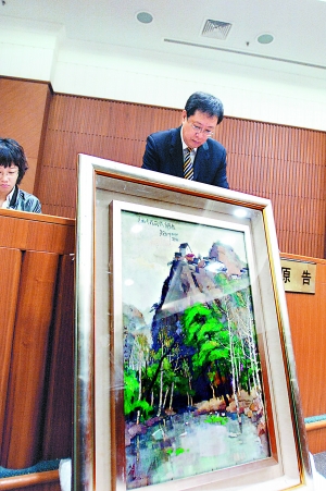 “快看,肯定是那幅畫。”上午9時,在旁聽人群的一陣騷動聲中,用塑料薄膜包裹著的大方框被抬進一中院的法庭。金茂律師事務(wù)所的王建軼律師打開包裝,一幅油畫展現(xiàn)在眾人面前!斑@是幅假畫。”王建軼律師說,他的委托人蘇敏羅以230萬元的價格從北京翰海拍賣有限公司拍得這幅畫,而此畫當時被介紹為吳冠中的作品。