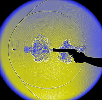 條紋攝影法是一種將氣體或液體中各區(qū)域的不同濃度用陰影表現(xiàn)出來的特殊技術(shù)!霸谖业膶嶒炇依铮覀兘(jīng)常會用到這個技術(shù),”Settles博士說,“比如在超音速風洞里,繪制飛行器周圍的震動波!