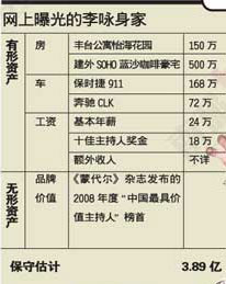 在06年被曝光的一份主持人走穴身價清單上,李詠以18萬的身價高居榜首。而后他代言某地板品牌的消息也引起爭議,節(jié)目組聲稱李詠只是跟老板合影,是品牌自己在炒作而已,堅決否認做了廣告,再加上名下價值百萬的保時捷跑車,李詠這個名字的含金量當(dāng)然讓人咋舌。在采訪中,與先前的韓喬生一樣,這些主持人都說自己沒什么錢,一個月也就一萬來塊,跟明星完全沒辦法比。話音剛落,李詠的名字又赫然出現(xiàn)在最有價值主持人排行榜榜首,可能是受金融危機影響,縮水1.1億,但總價也有3.89億。
