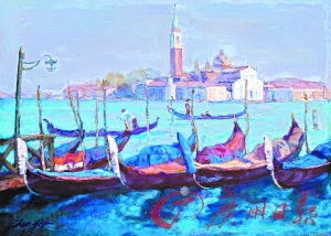 而陳逸飛的《威尼斯》以前從沒(méi)有拍賣過(guò),是現(xiàn)在的擁有人1999年直接向畫家購(gòu)買的。取景是威尼斯著名的大運(yùn)河 ,前面泊著4艘運(yùn)河木船 ,運(yùn)河上另有兩艘木船,對(duì)岸是著名的圣馬可大教堂。朦朧的煙霞,叫人分不清是早晨還是黃昏。采用的意象表達(dá)手法是陳逸飛作品中極為罕有的。早在1990年,畫家曾繪過(guò)一幅同名的風(fēng)景畫。然而兩幅畫有很大的不同。1990年那一幅層次較分明,色彩也較濃烈,采用的是陳逸飛一貫的寫實(shí)手法。9年后的《威尼斯》用色較淡,景物的處理較隨意,很有印象派大師莫奈的影子。