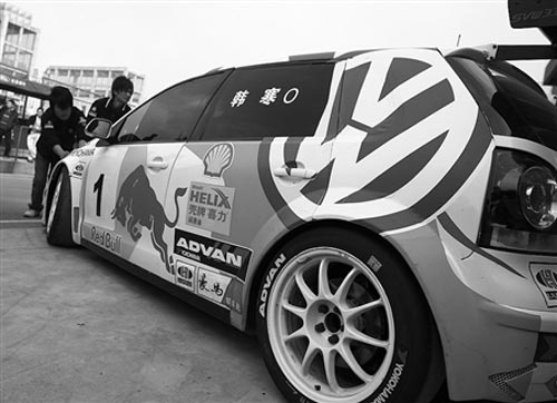 昨日中午1點(diǎn)多,記者趕到成都金港賽道,比賽還沒有開始,工作人員正在檢修各個(gè)選手的賽車。記者走進(jìn)大眾333車隊(duì)的車庫(kù),發(fā)現(xiàn)一輛賽車上寫了一個(gè)大大的“寒”字,記者轉(zhuǎn)到車的另一邊,果然,側(cè)面車窗上清楚地貼著“韓寒”兩個(gè)字。